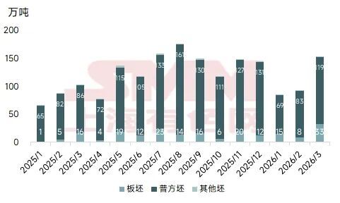 2026年第一季度国内钢坯出口表现亮眼,呈现不断增长趋势,据海关总署数据统计,2026年3月国内钢坯出口量153万吨,环比增长66.0%,同比增长47.9%,创近年来同期单月新高。究其原因,一方面春节后国内建材需求表现持续不温不火,“金三银四”并未明显显现,多地区库存长期处于高位,外销钢坯成为缓解内销压力的有效方式;另一方面,地缘政治问题突发,霍尔木兹海峡通行受限,中东钢材出口受阻,据了解,2025年东南亚从中东进口钢材约231万吨,其中高达97%为半成品钢坯,传统上依赖伊朗等出口的东南亚国家,把采购重心向中国、印度倾斜,而中国钢坯出口价格相比印尼、印度更有优势。据海关总署数据统计,2026年1-3月国内钢坯出口总量330万吨,同比增长28.5%。